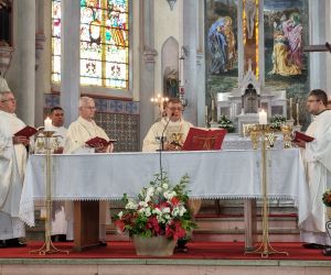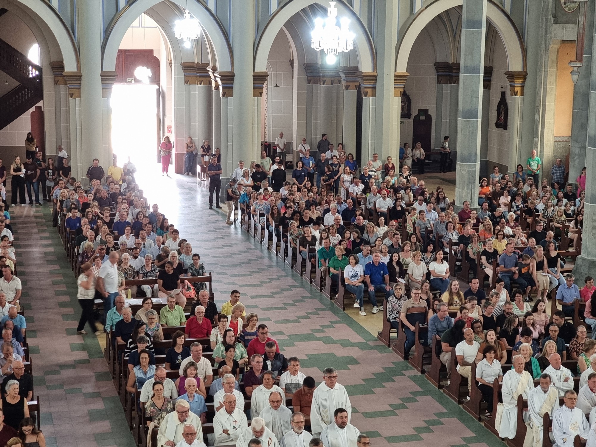 Na chegada à Catedral, o Bispo Diocesano, Dom Itacir Brassiani, juntamente com o Bispo Emérito, Dom Aloísio Alberto Dilli, fez memória do batismo com a bênção da água batismal e a aspersão do povo. A Missa Solene foi presidida por Dom Itacir e concelebrada por todo o clero.