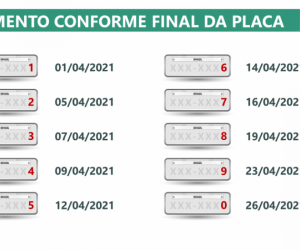 O calendário final de pagamento do IPVA 2021 se encerra em abril, conforme o final da placa de cada veículo (confira na imagem). No mês de abril o proprietário do veículo só contará com os descontos de Bom Motorista e Bom Cidadão, se tiver.