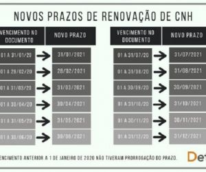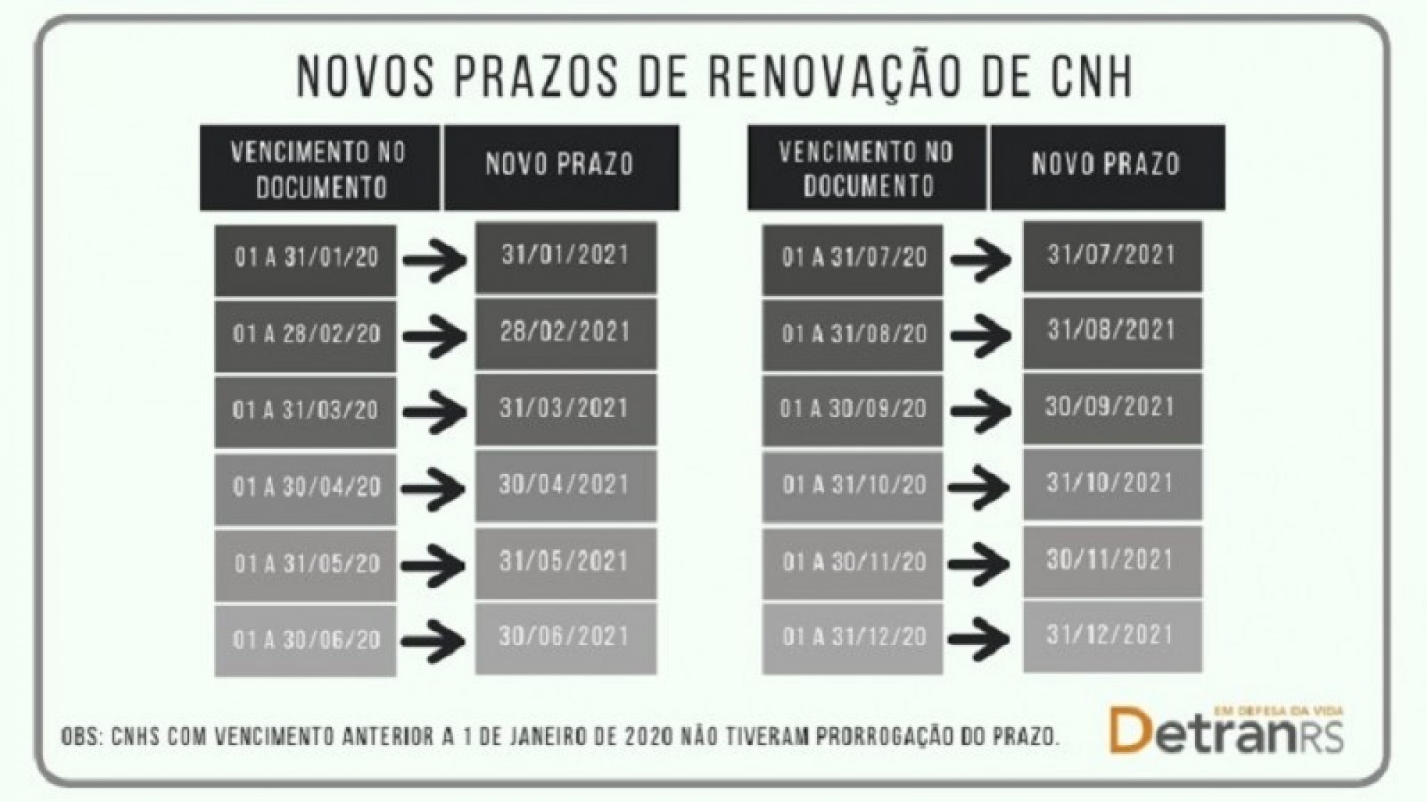 O restabelecimento dos prazos para renovação da CNH vale para todos os condutores que tiveram habilitação vencida em 2020. A partir de 1º de janeiro de 2021, a contagem do prazo será retomada, com o acréscimo de um ano do mês de vencimento que consta no documento. Ou seja, CNHs com data de validade de janeiro de 2020 poderão renovar até 31 de janeiro de 2021; para as vencidas em fevereiro de 2020, a renovação poderá ocorrer até 28 de fevereiro de 2021; e assim sucessivamente, até 31 de dezembro de 2021 para as habilitações com validade em dezembro de 2020.