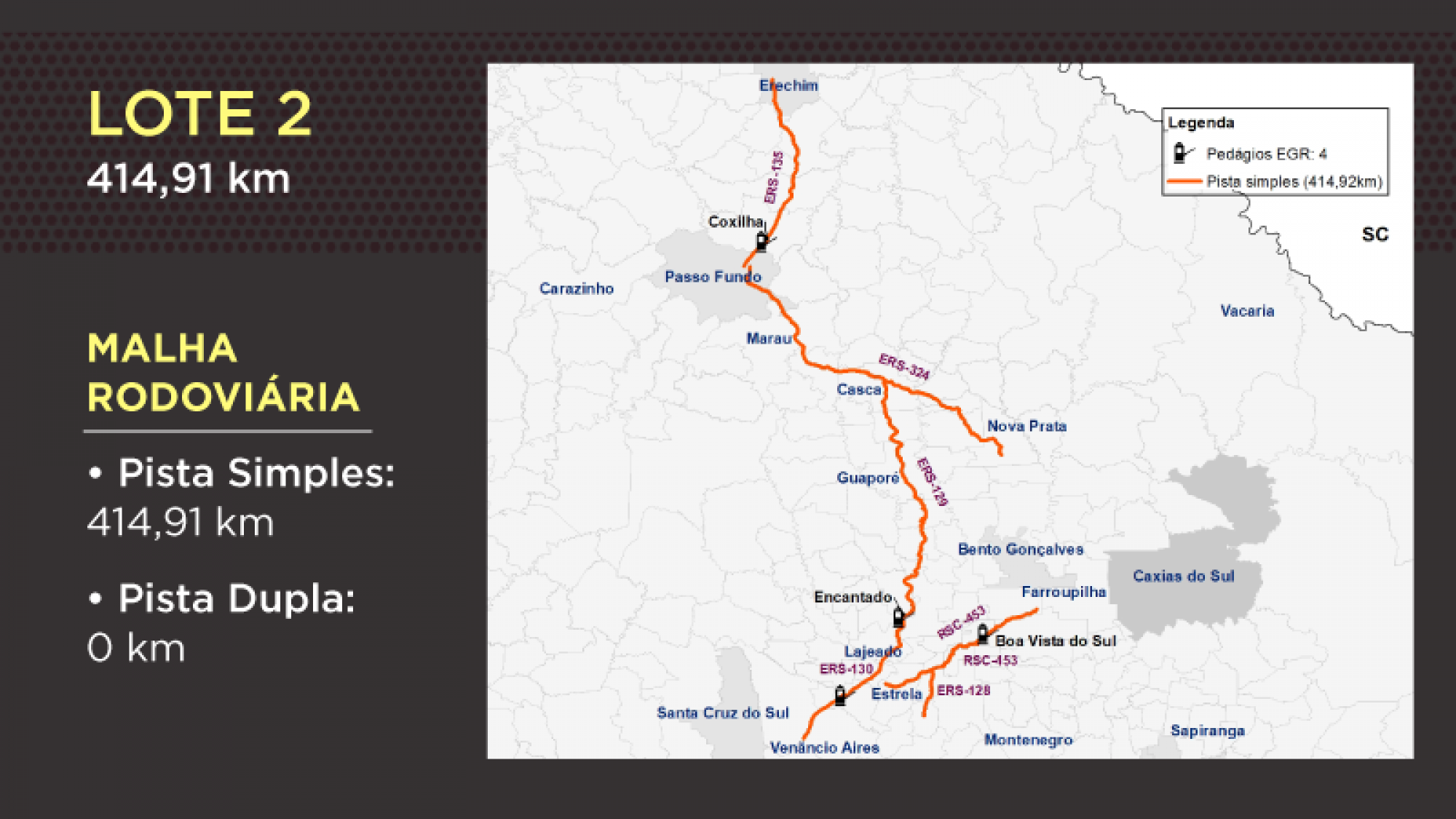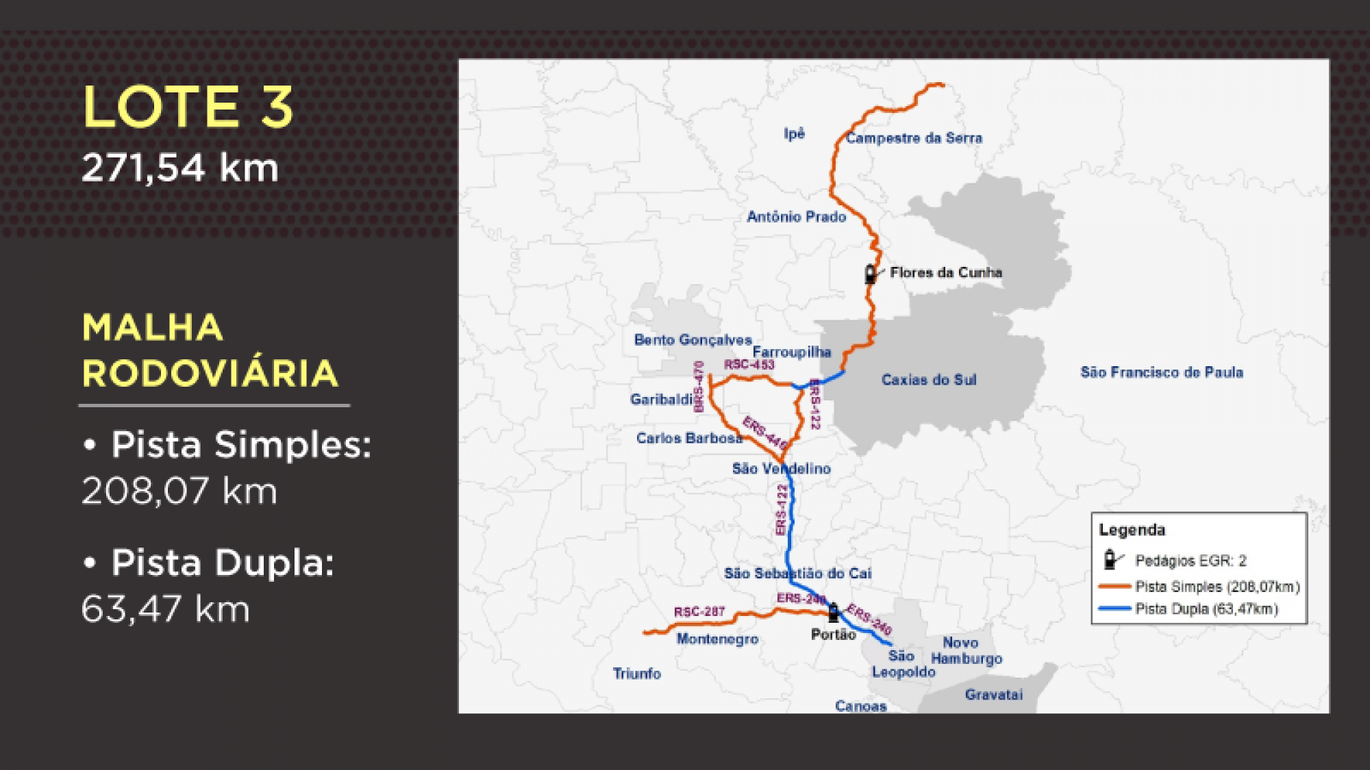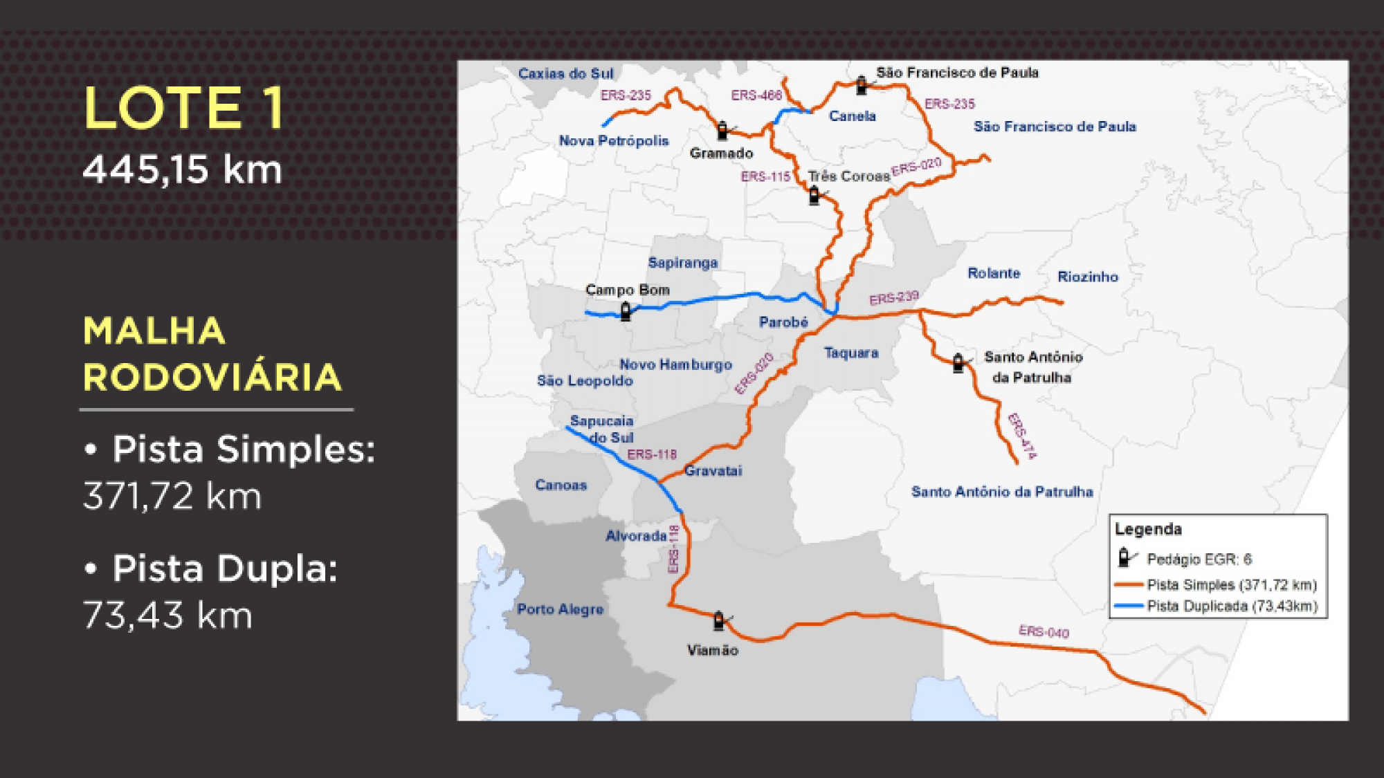 As estradas administradas, em sua maioria, pela Empresa Gaúcha Rodovias (EGR), foram divididas em três lotes. A concessão será de 30 anos e o critério adotado para a divisão focou na proximidade geográfica, lotes viáveis sob forma de concessão comum e extensão capaz de atrair o maior número de investidores.