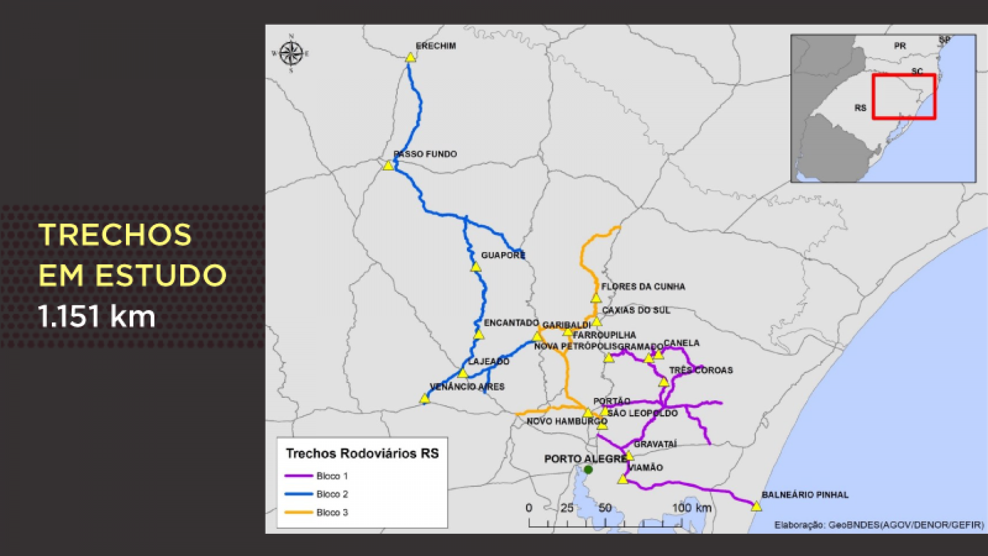 O governo do Estado, em parceria com o Banco Nacional de Desenvolvimento Econômico e Social (BNDES), projeta para o fim de maio a conclusão dos estudos que definirão o modelo de viabilidade para a concessão de 1.151 quilômetros de rodovias estaduais à iniciativa privada.