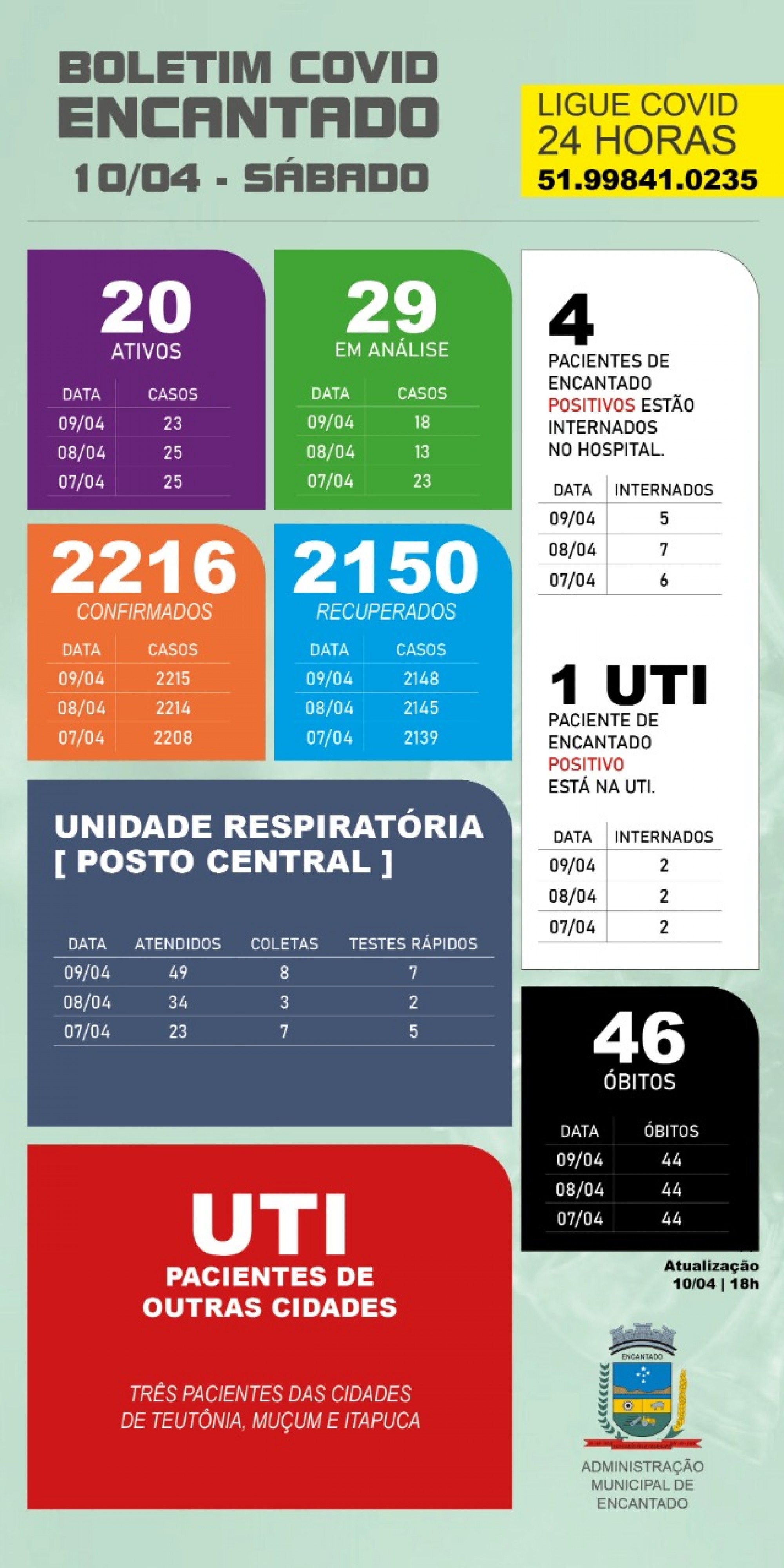 Em boletim divulgado pela Secretaria da Saúde de Encantado, mais dois óbitos foram contabilizados. Agora Encantado registra 46 mortes decorrentes do Coronavírus.