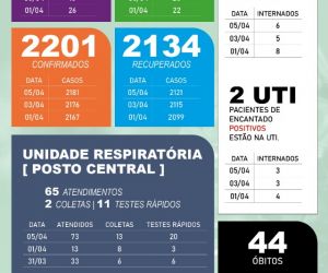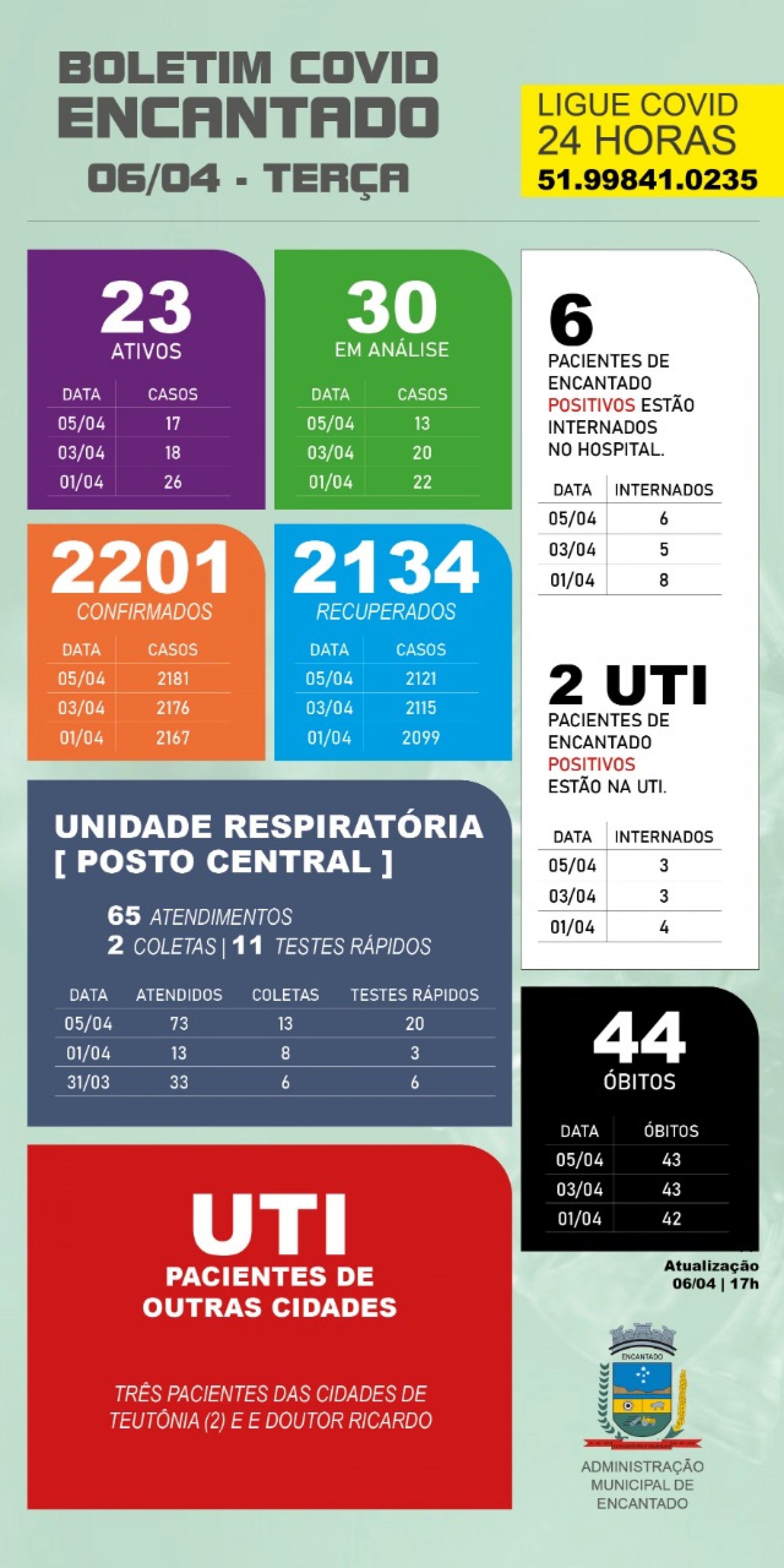 Diminuição no número de pacientes da cidade em leitos de UTI. De acordo com o relatório são dois internados. A Ala-Covid conta com seis moradores da cidade. O número de óbitos subiu para 44 e os casos ativos são 23.