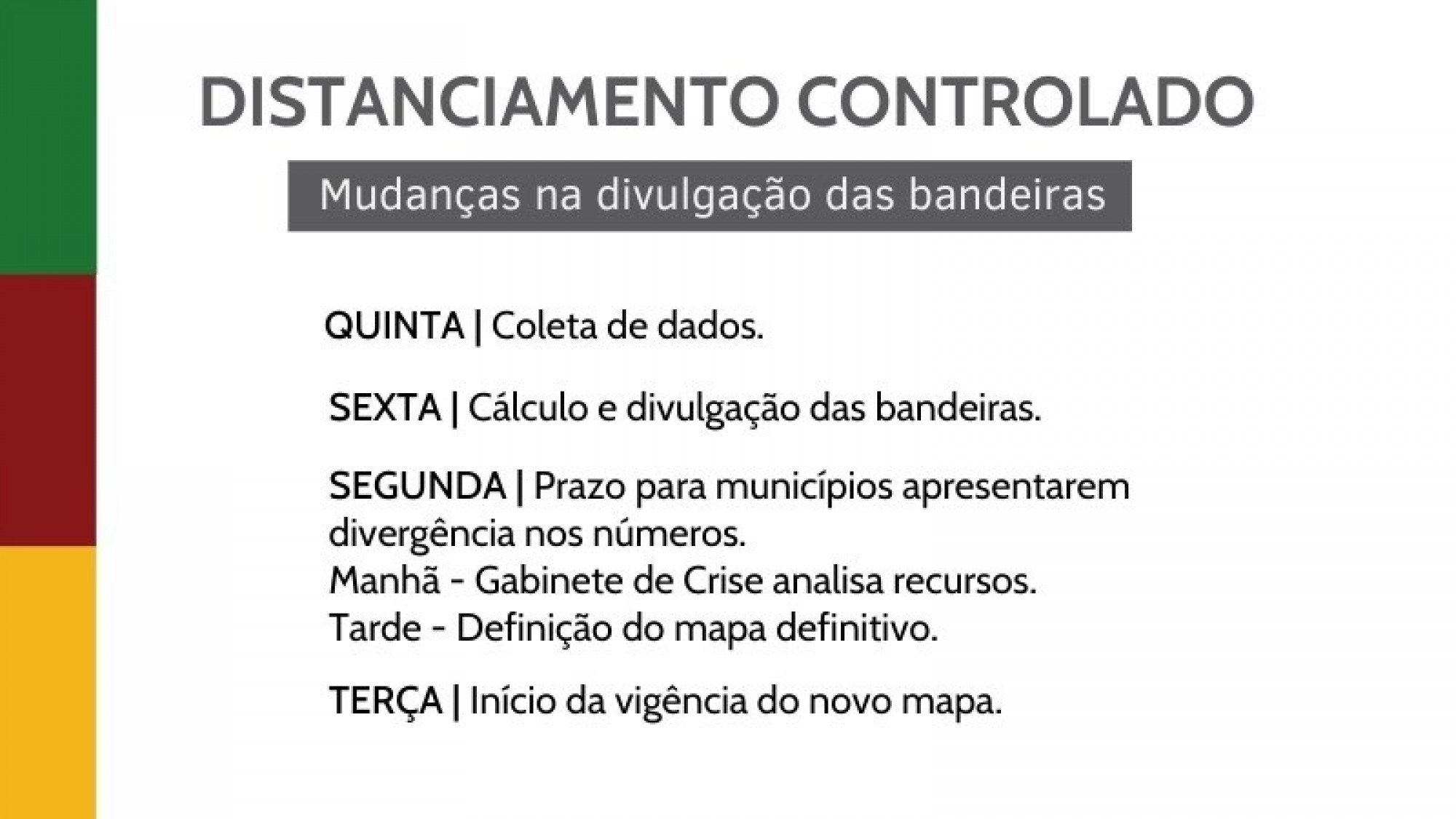 Até a última rodada do Distanciamento Controlado, as coletas de dados eram na sexta, os cálculos das bandeiras eram feitos e divulgados no sábado para entrarem em vigor na segunda-feira.