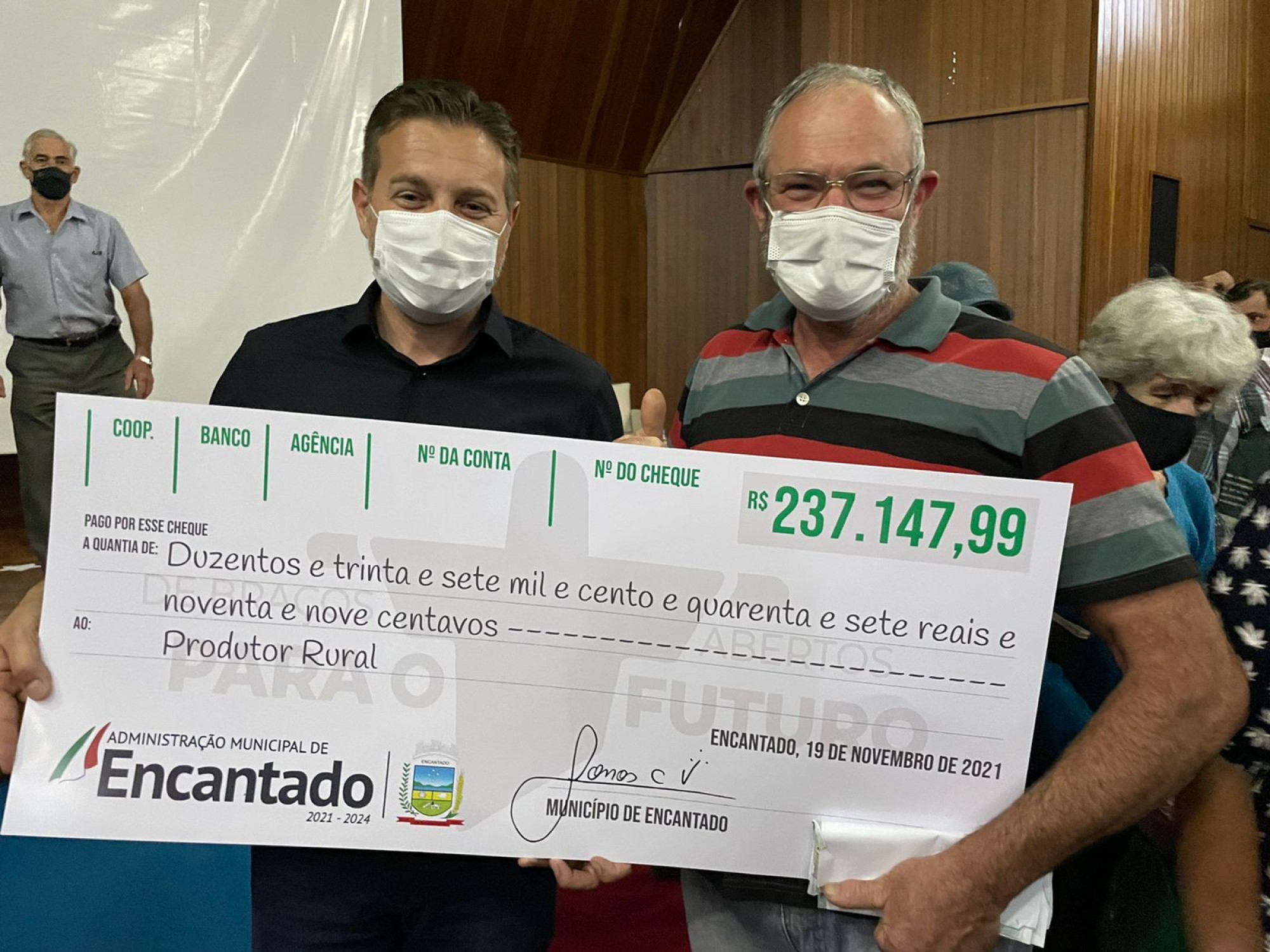 Ao todo foram repassados R$ 237.147,99 mil para 689 agricultores de várias localidades de Encantado. Para o prefeito Jonas Calvi, mais do que um incentivo financeiro, a ação representa um reconhecimento ao trabalho desenvolvido no meio rural do município.